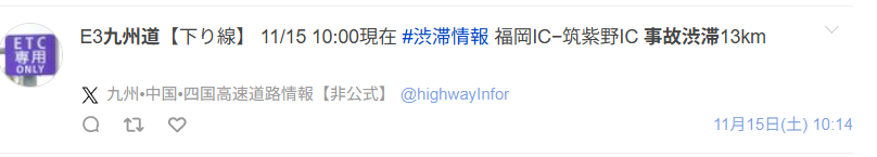 筑紫野IC付近で事故渋滞が発生しており、旅行の予定が大幅に遅れるハプニング