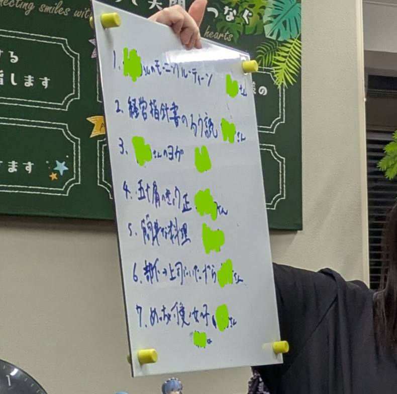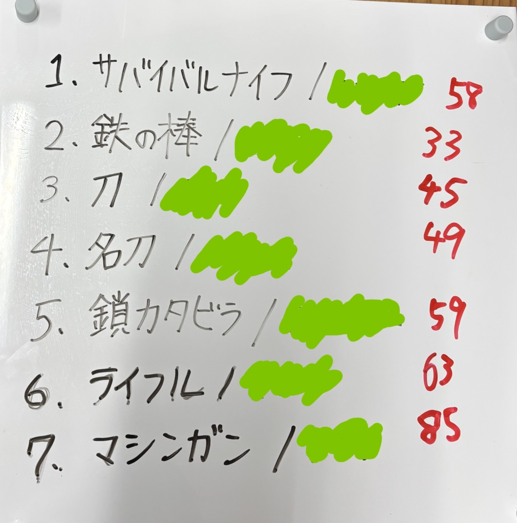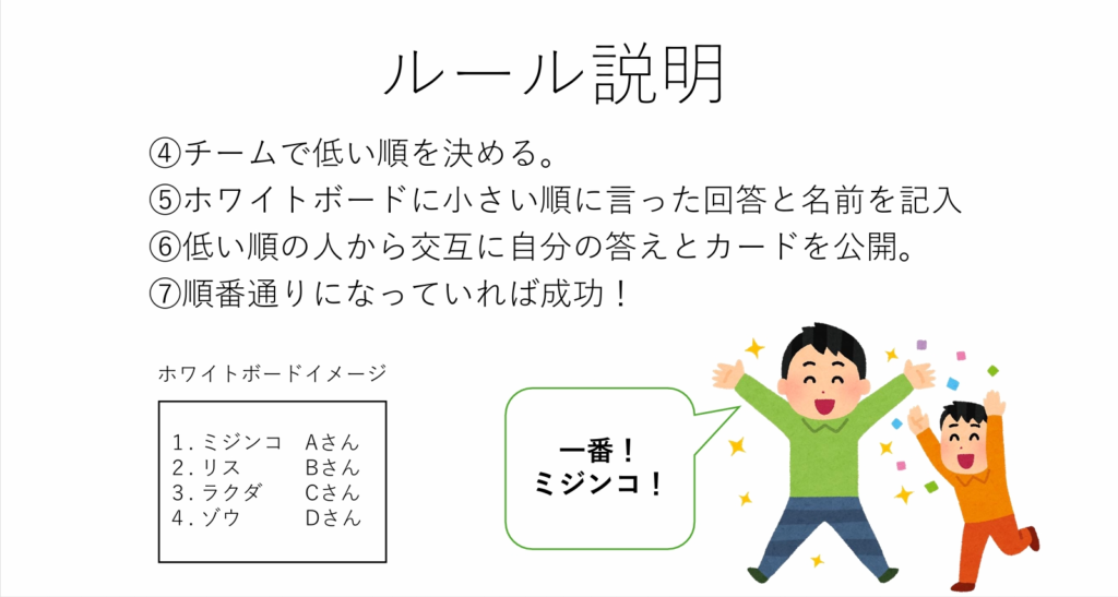しかし本人が発表するまで誰も正解が分からないハラハラ感のおかげで、一人ずつ番号を発表する度に大盛り上がりしたゲームでした。